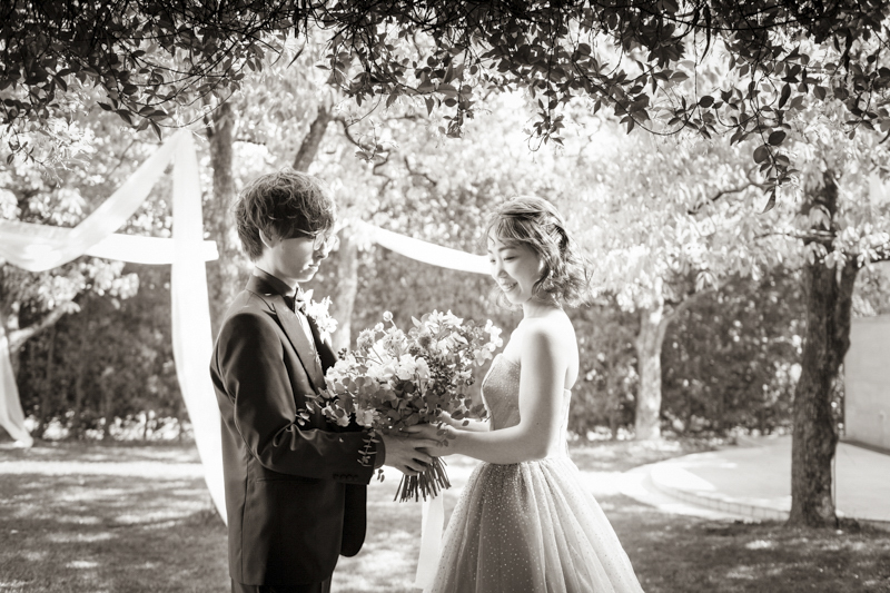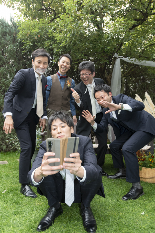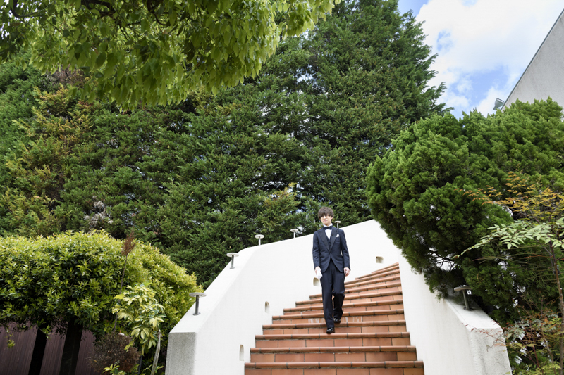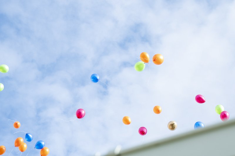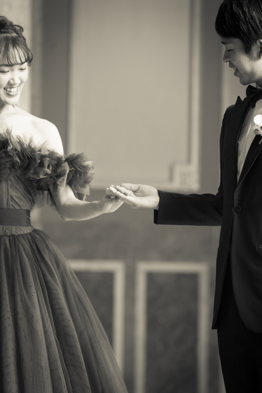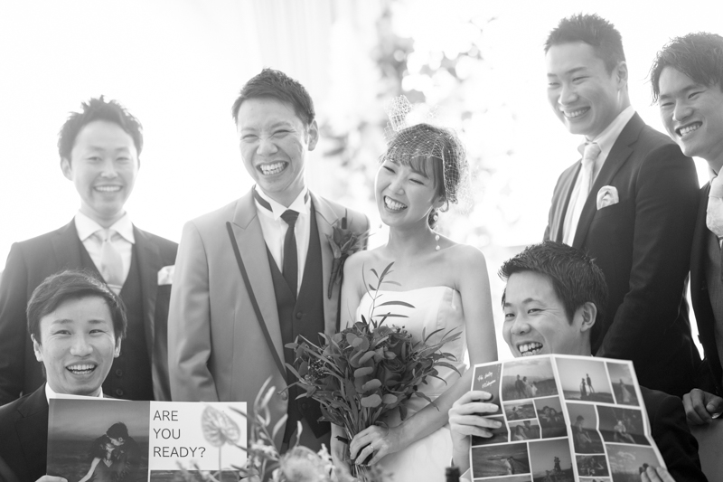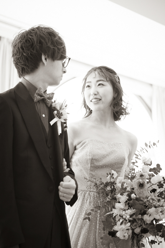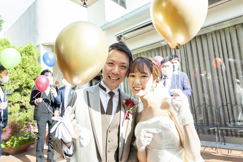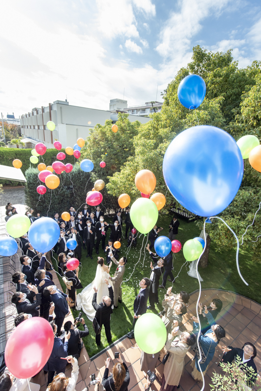 センス抜群のおふたり。ドレス、タキシード姿はもちろんのこと、ご用意されたアイテム類やパーティー会場の装花まで完璧でした。ノゾミさんの真っ白なドレス姿はとってもお綺麗でした。お支度完成後の、ファーストミートでは、感極まったヒロミチさんは思わず涙が溢れ出ていました。そんな素敵な瞬間を撮影させていただき、私たちまで幸せいっぱいのお時間を過ごさせていただきました。祝福に包まれたバルーンリリースは天気よし、おふたり、ゲストの皆さまの表情よしの最高の瞬間でした!