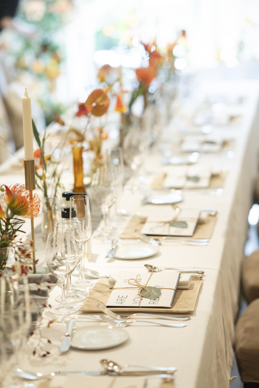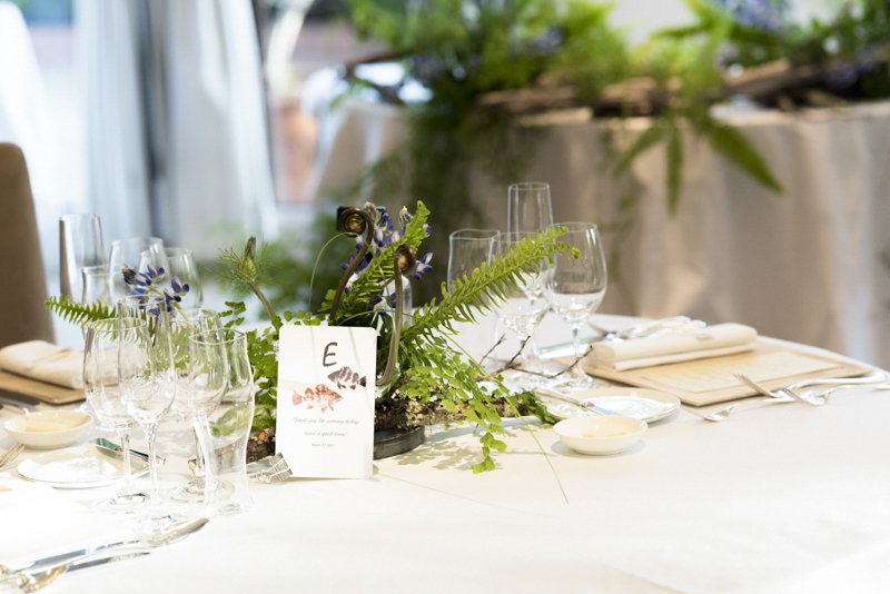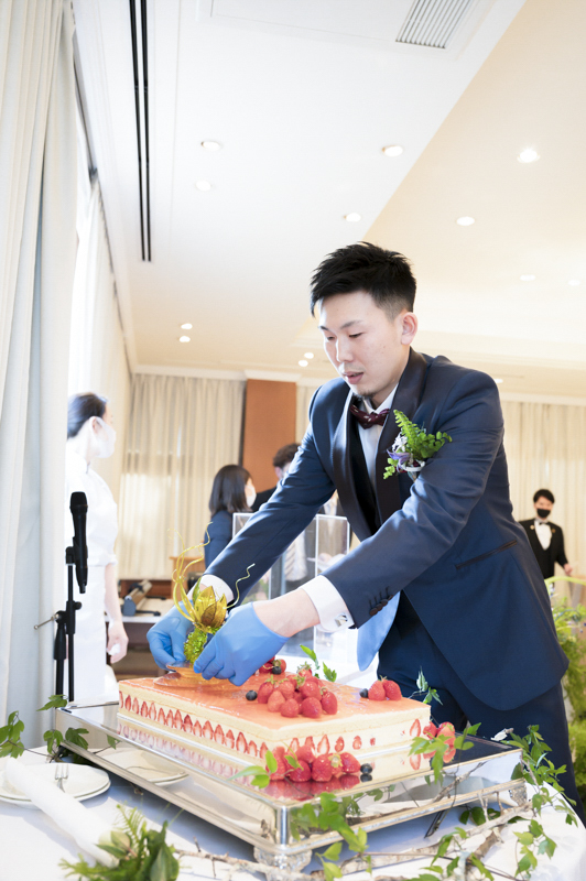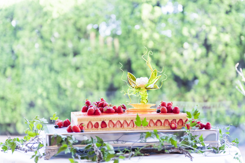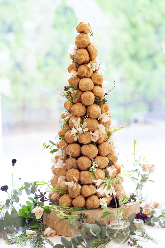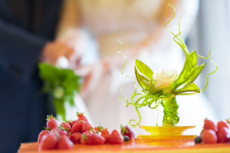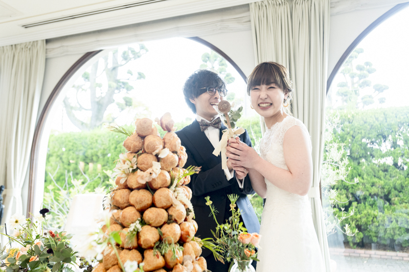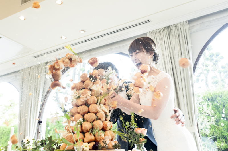 「一番の楽しみはクロカンブッシュです!!」そんなことを打合せの最初に教えてくださいました。お家にあるペットボトルで入刀の練習をされたとか。本番は豪快な入刀で、漫画のように弾けるクロカンブッシュたちが印象的でした。
