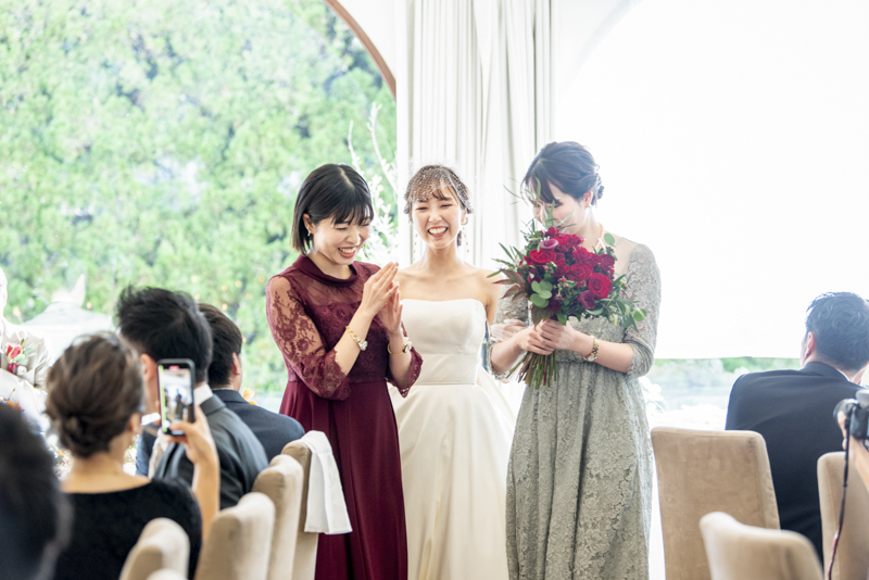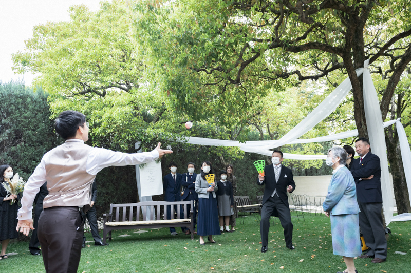 ご家族を大切になさっているおふたりのご結婚式。ガーデンで過ごすお時間にはナツキさまからブーケトスを、野球好きのルイトさまからはご両親へボールトスをされ、そのボールの中には気持ちのこもったメッセージが綴られていました。披露宴中のムービーやお手紙では感動に包まれ、歓談中は笑い声で溢れる、心がほっこりとさせられるような素敵な一日でした。