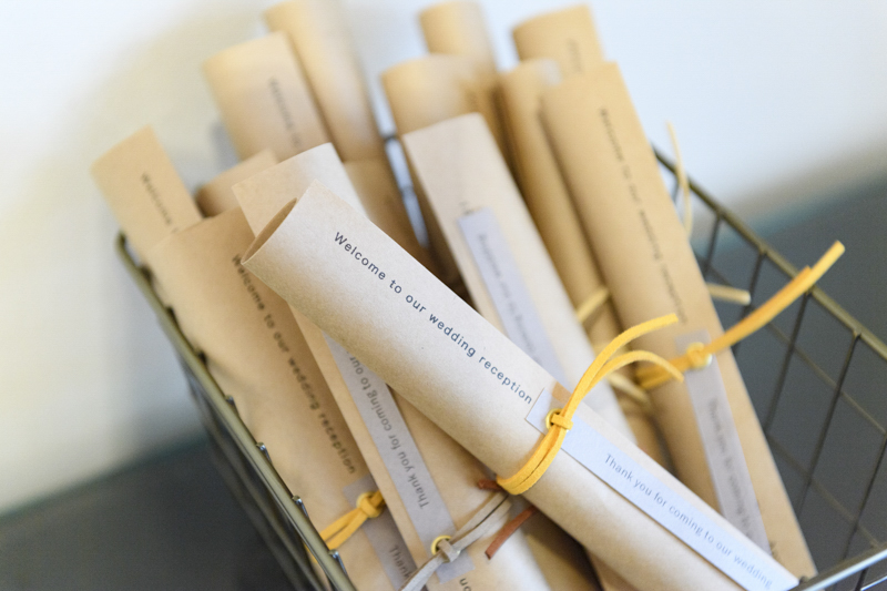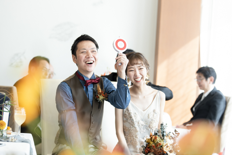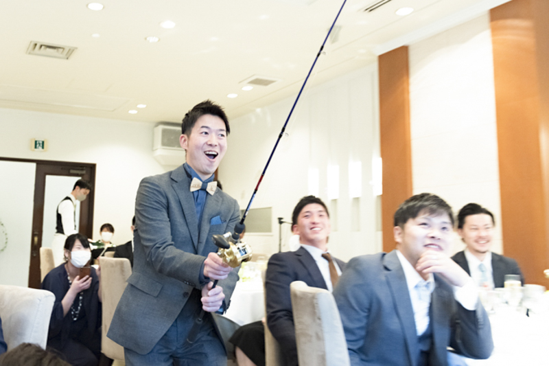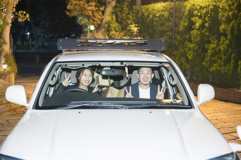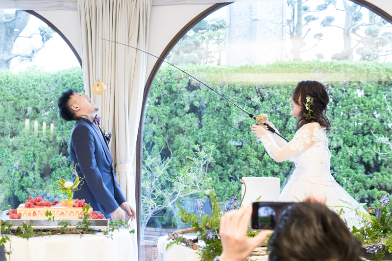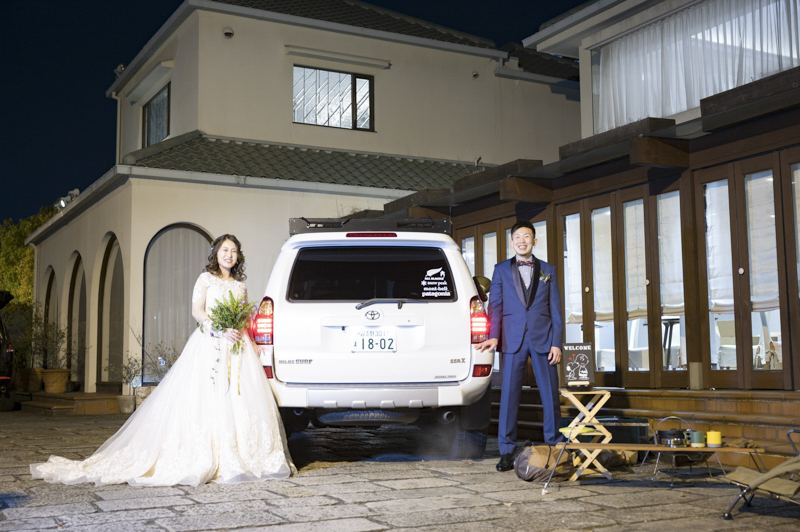 お打合せから当日お車で帰るまで、ずっと笑顔を見せてくださったおふたり。ケーキの上の飴細工やプチギフトはタクヤさんの手作り。一つ一つのアイテムにこだわりがあり、ゲストの皆さんは足を止めて眺めてらっしゃいました。「好きなことは釣りとキャンプ!」2つの要素をたくさん用いたパーティーでは、ゲストの皆さんと一緒に楽しむ演出ばかりで、笑い声が響く、素敵な一日でした。愛車と記念撮影もしつつ、会場を後にする姿まで撮影させていただき、どんな瞬間も鮮明に思い出すことができます。楽しむことが大好きなおふたりらしいご結婚式でした。
