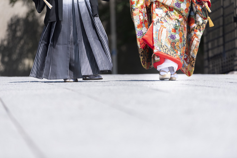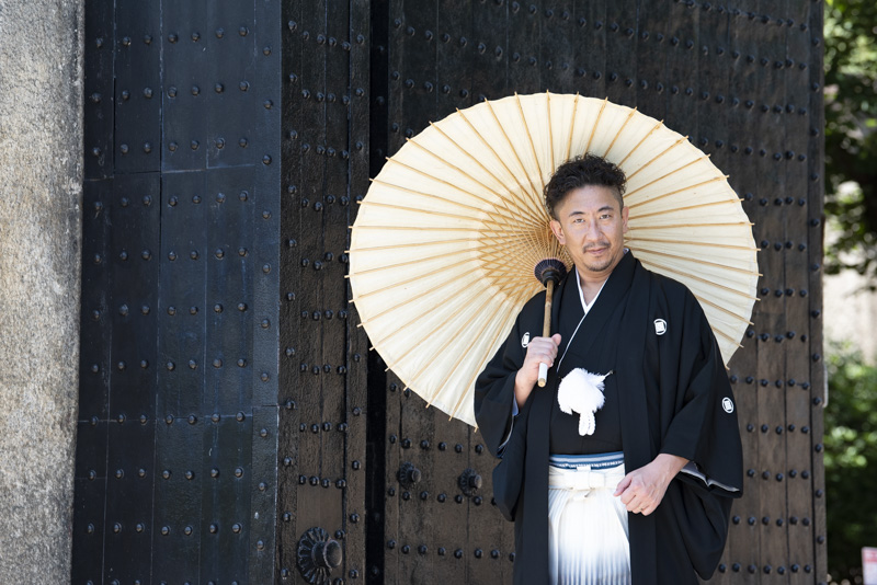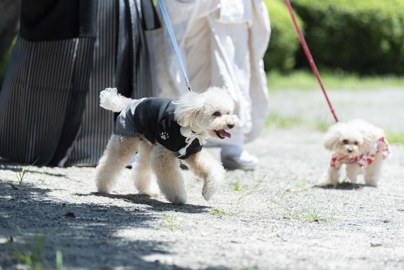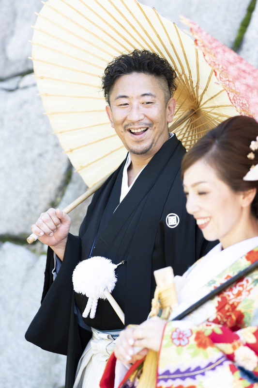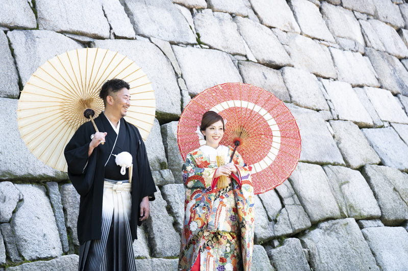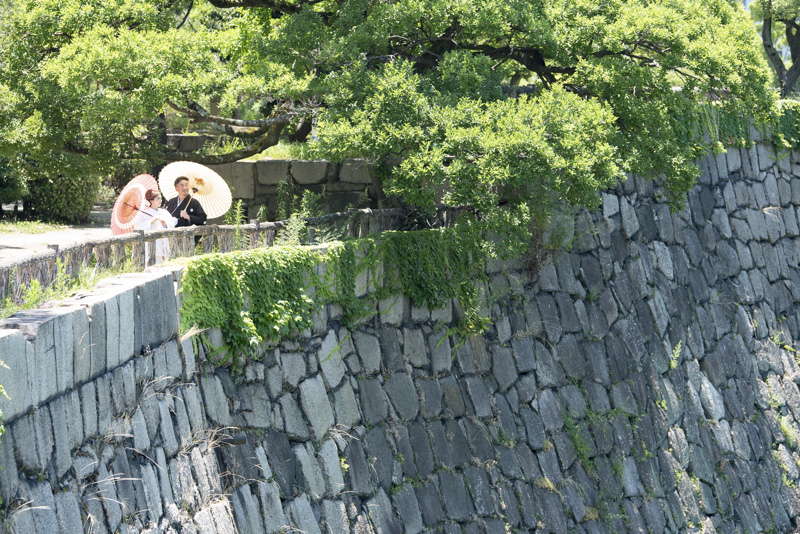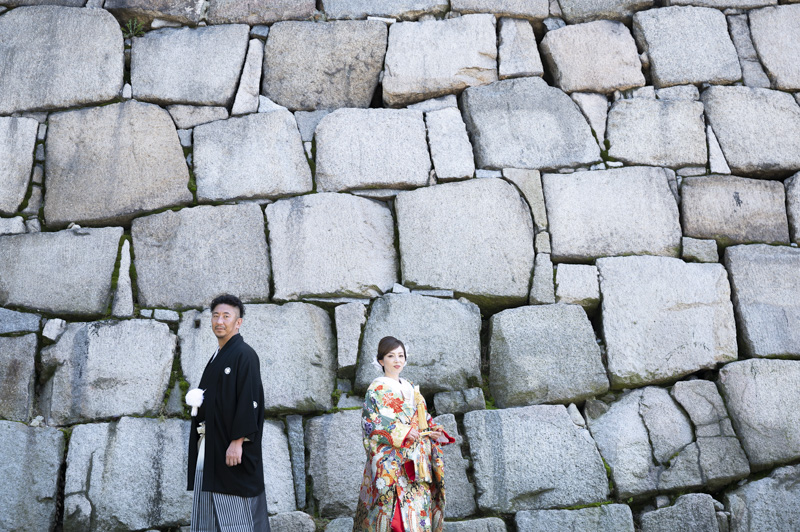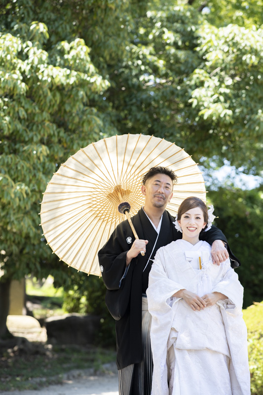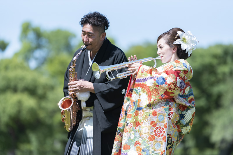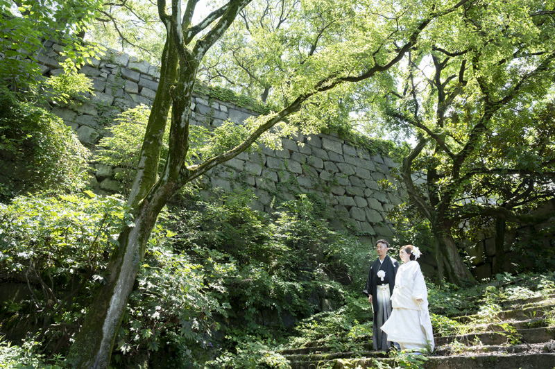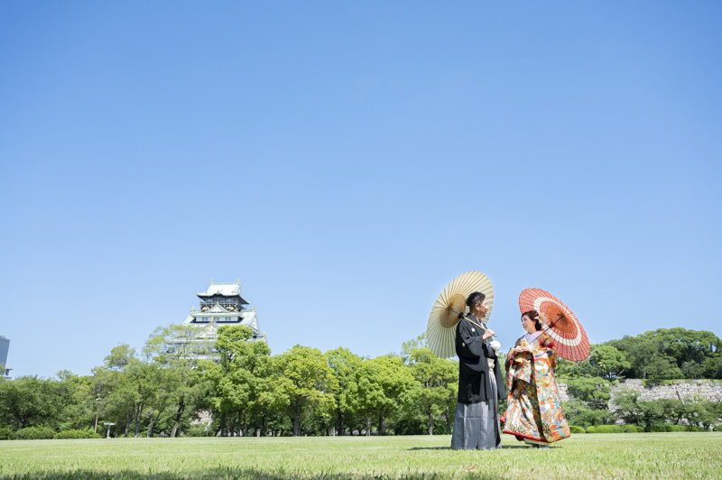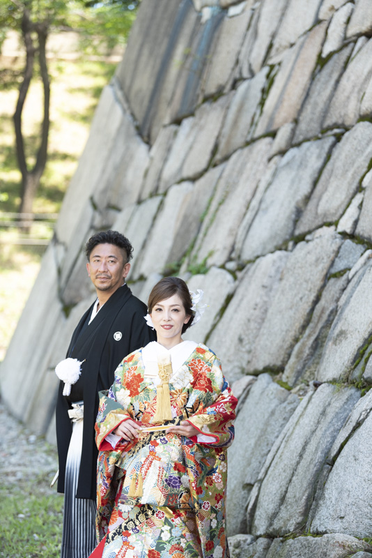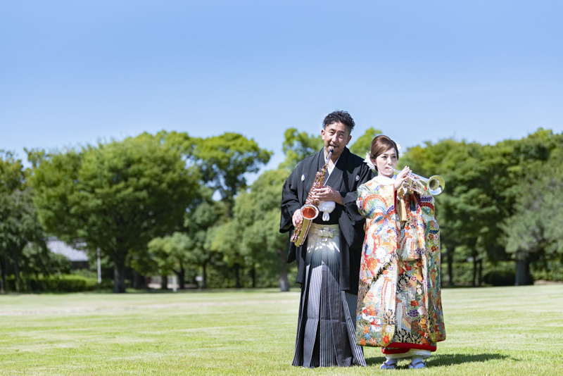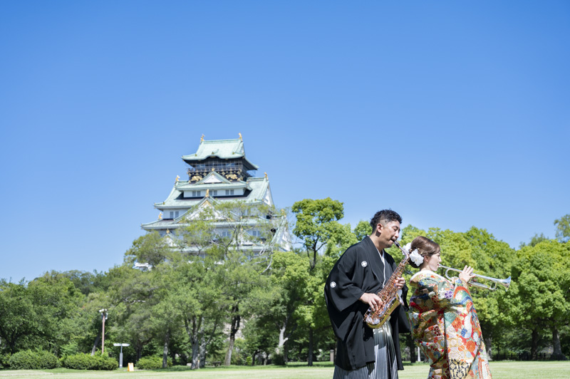 結婚するにあたり、和装の撮影場所に大好きな大阪城を選びました。梅雨も明けてお天気に恵まれた撮影日。おふたりの愛犬や、共通の趣味である楽器と一緒に撮影するなど、思い入れたっぷりの楽しい撮影になりました。