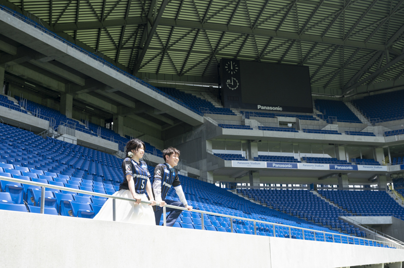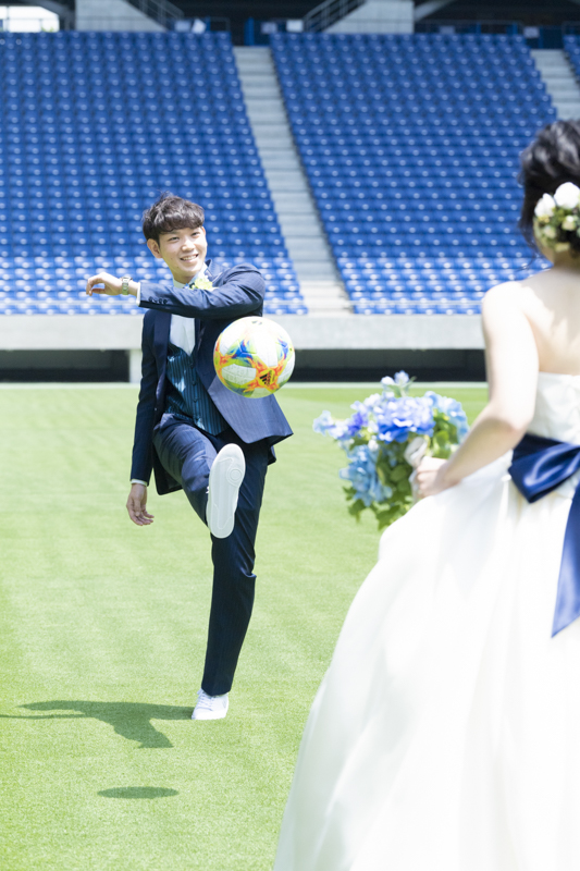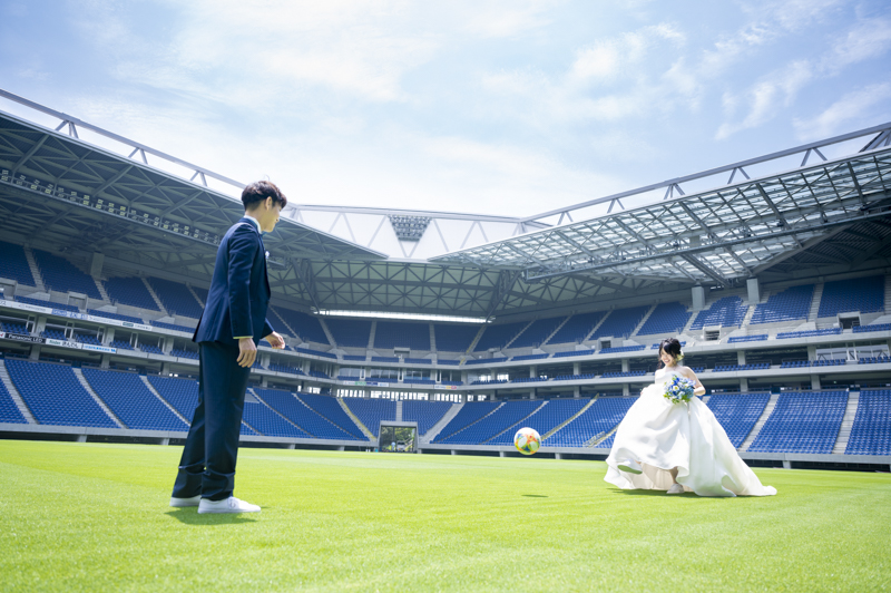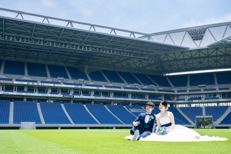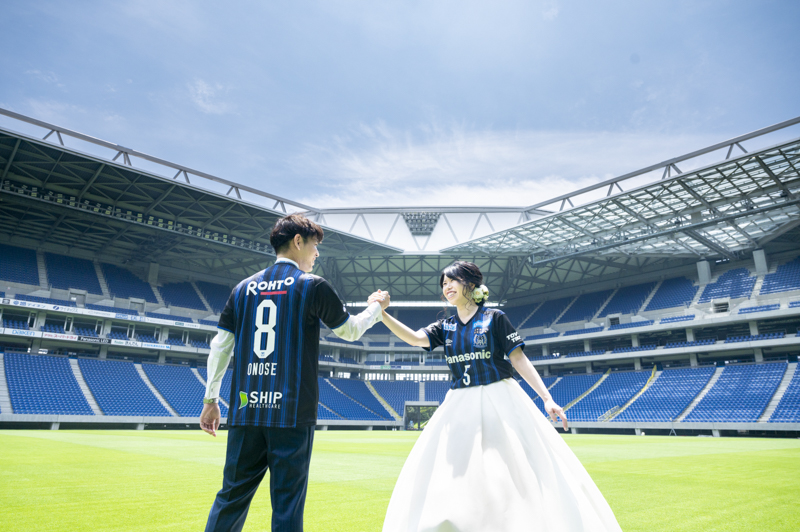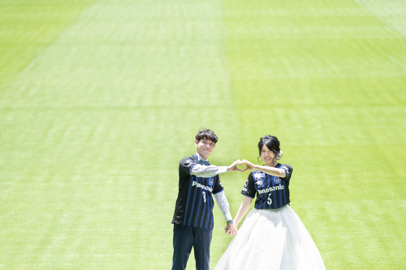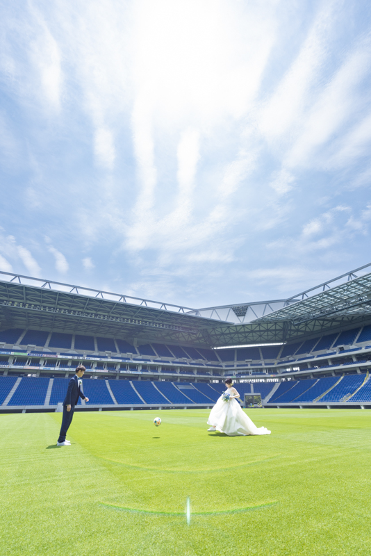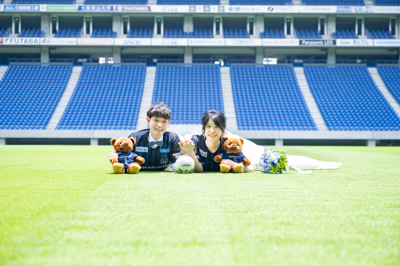 いつも応援している選手が駆け回っているピッチの真ん中で撮影したい!とおっしゃっるくらい、ガンバ大阪の大ファンのおふたり。私たちも初めての経験でした。とてもフワフワの芝の上で、お気に入りのユニフォームを着たり、おふたりでボールを蹴り合ったりして、たくさんのお写真が残りました。スタジアムでの撮影を心から楽しでくださり、笑顔いっぱいの一日でした。