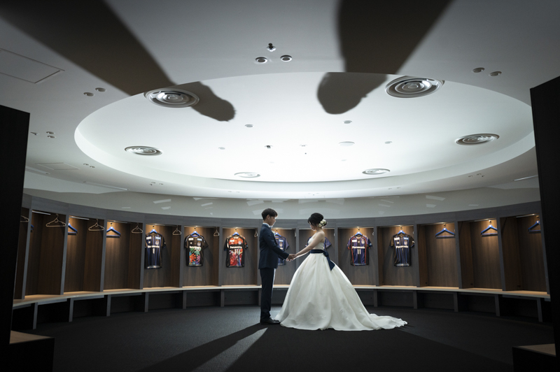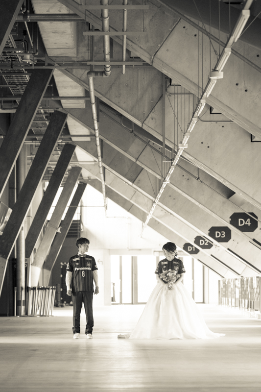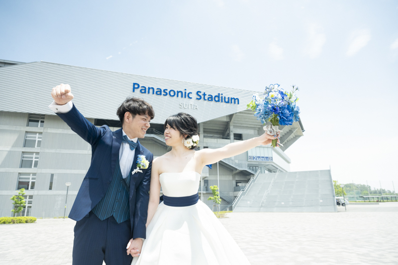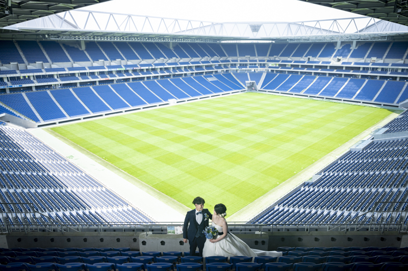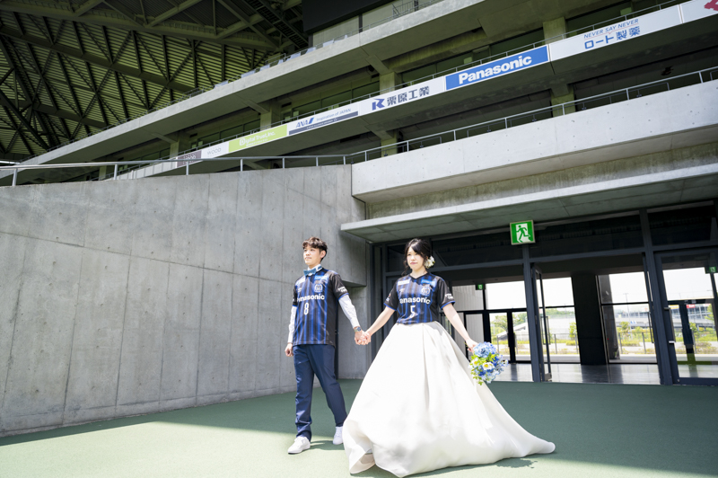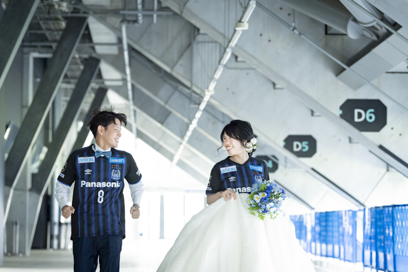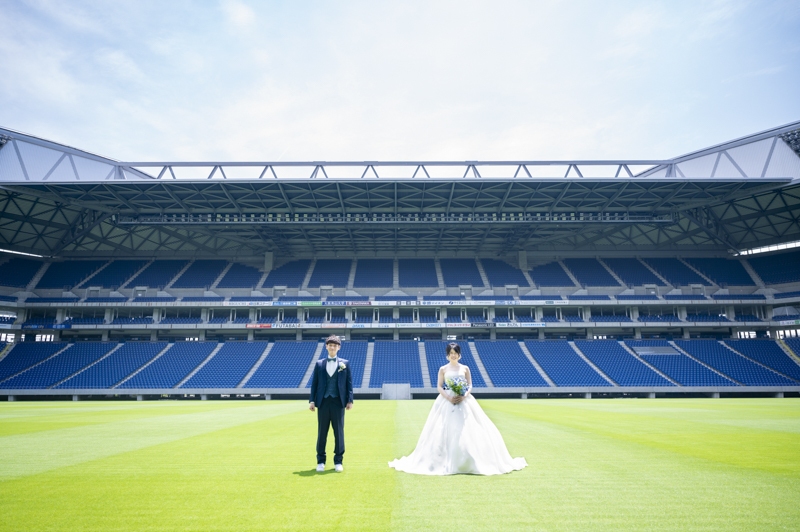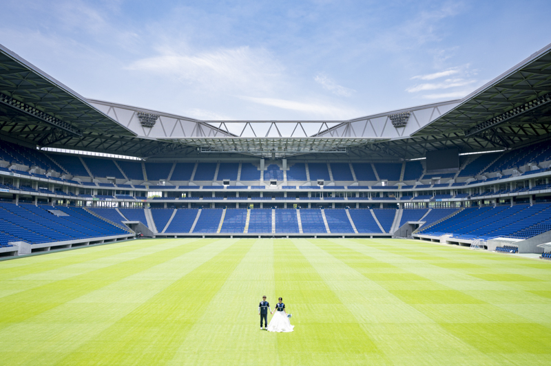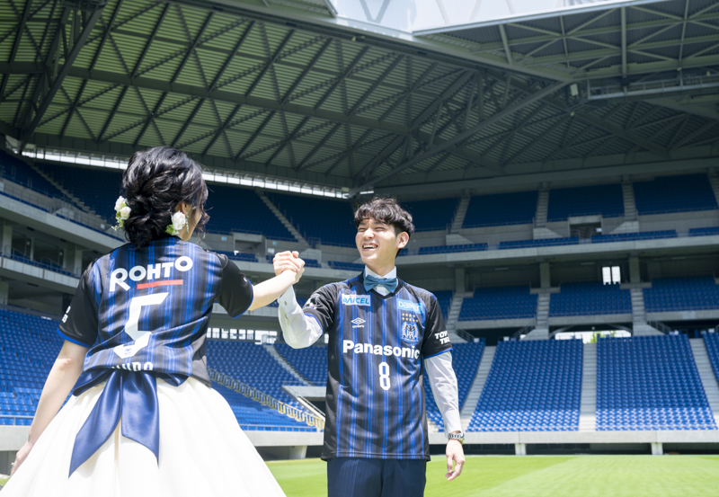 いつも応援している選手が駆け回っているピッチの真ん中で撮影したい!とおっしゃっるくらい、ガンバ大阪の大ファンのおふたり。私たちも初めての経験でした。とてもフワフワの芝の上で、お気に入りのユニフォームを着たり、おふたりでボールを蹴り合ったりして、たくさんのお写真が残りました。スタジアムでの撮影を心から楽しでくださり、笑顔いっぱいの一日でした。