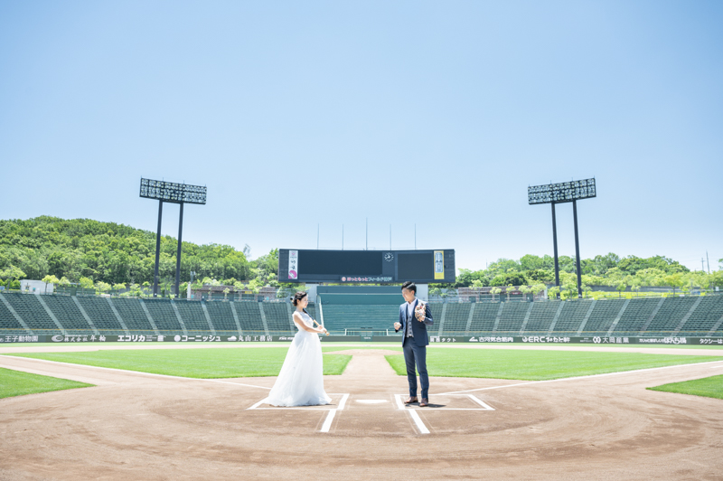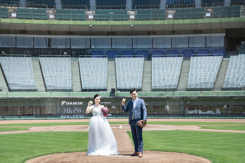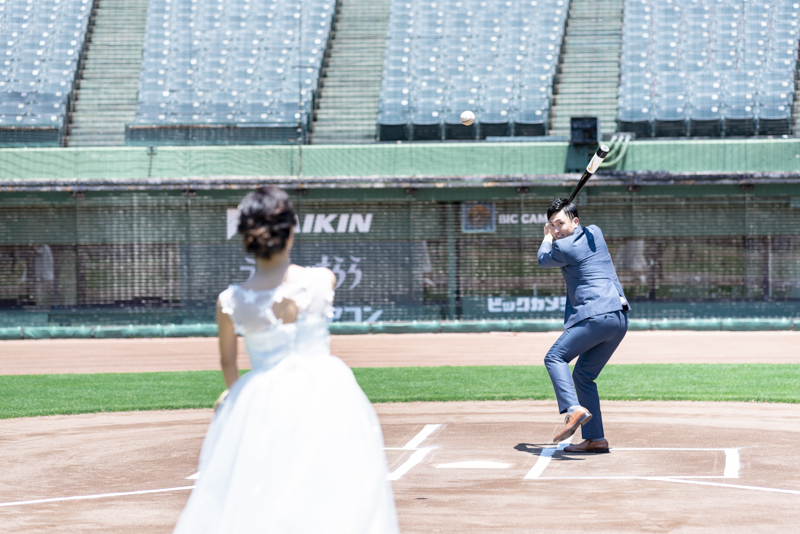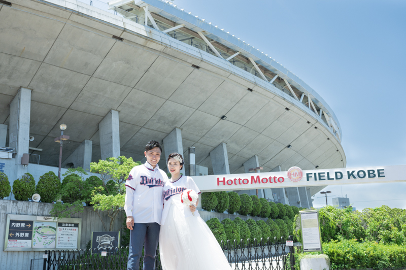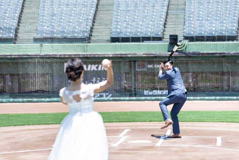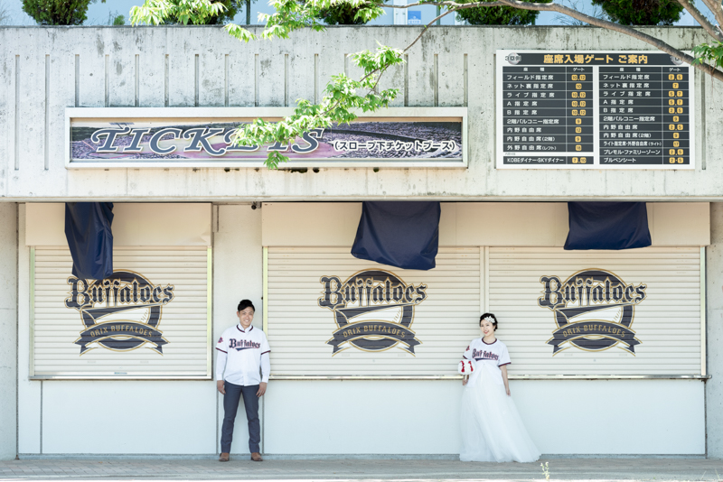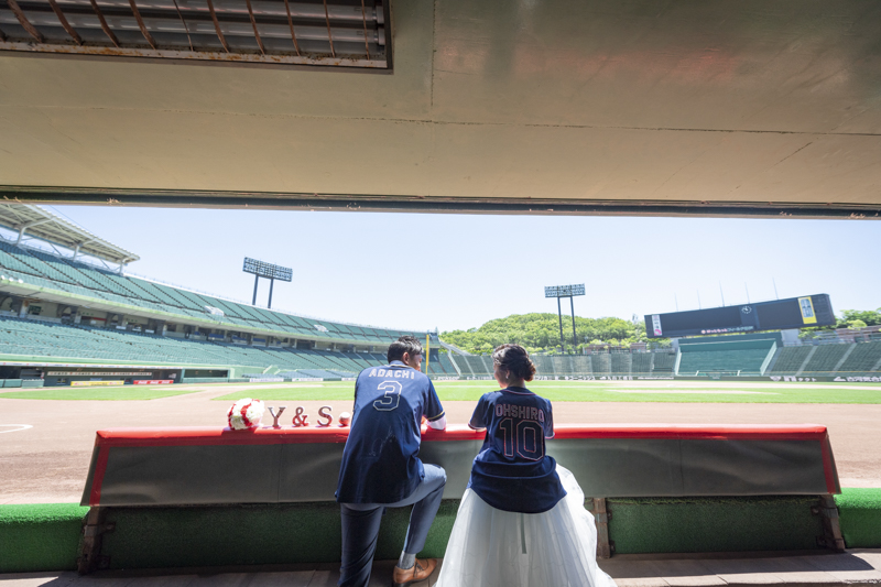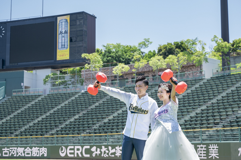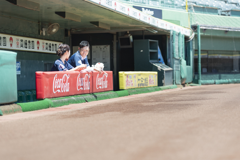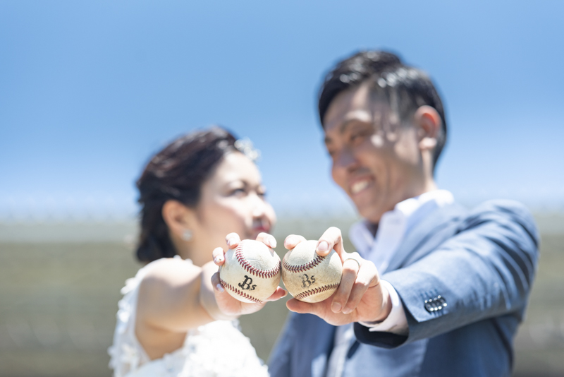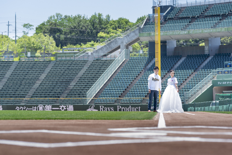 大好きなオリックス・バッファローズのスタジアムで後撮りをされたおふたり。スズカさんからいつもの感謝を込めた、ユウタさんへのプレゼントでした。応援で着ているユニフォームや、たくさんの手作りアイテム、ピッチャーだったユウタさんは盗塁やピッチングを楽しまれていました。球場に着いた時から帰るまで、私たちまでとても楽しく撮影させていただき、笑顔溢れる一日でした。