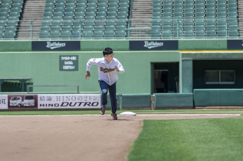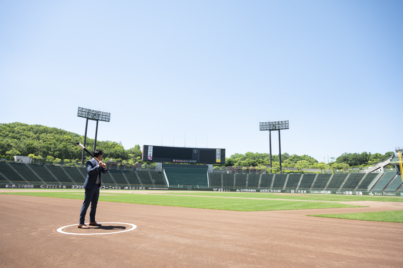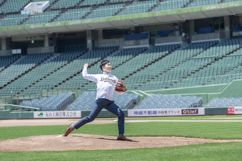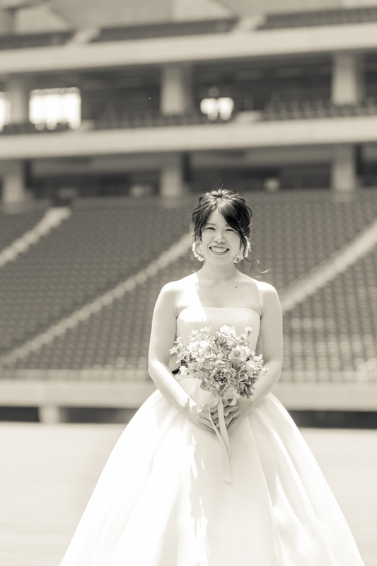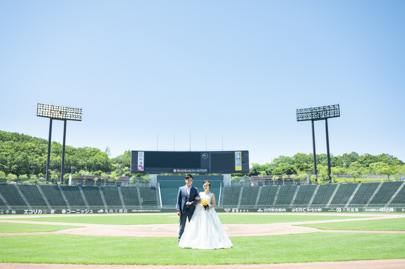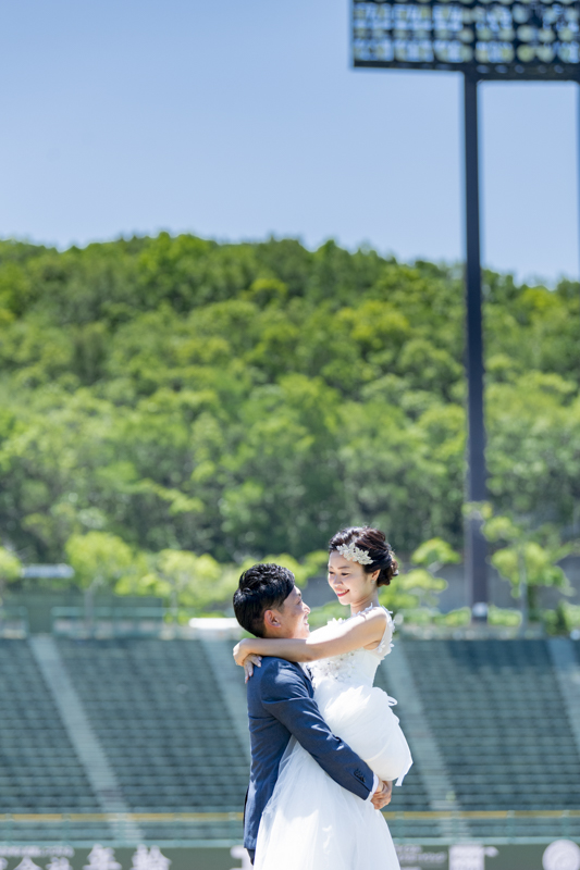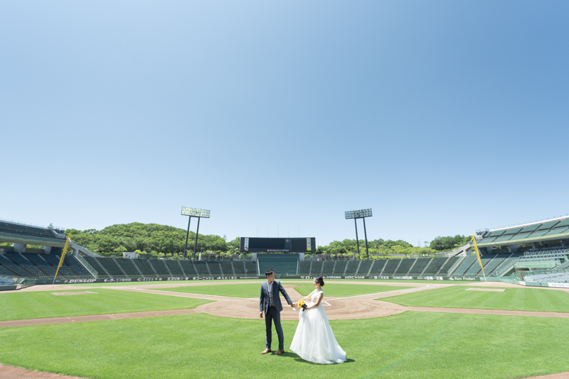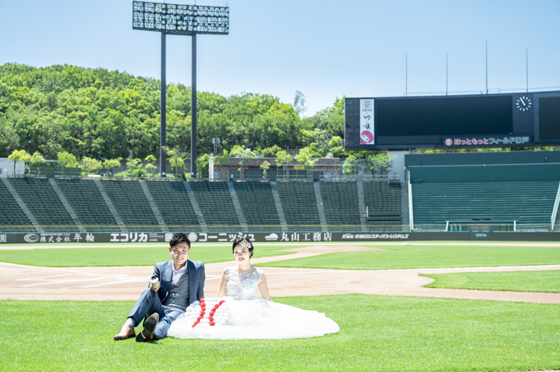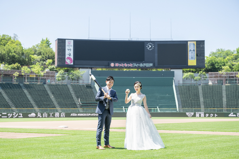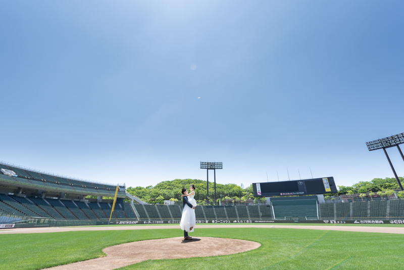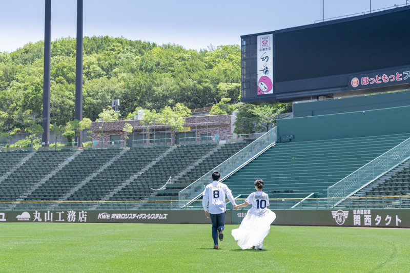 大好きなオリックス・バッファローズのスタジアムで後撮りをされたおふたり。スズカさんからいつもの感謝を込めた、ユウタさんへのプレゼントでした。応援で着ているユニフォームや、たくさんの手作りアイテム、ピッチャーだったユウタさんは盗塁やピッチングを楽しまれていました。球場に着いた時から帰るまで、私たちまでとても楽しく撮影させていただき、笑顔溢れる一日でした。